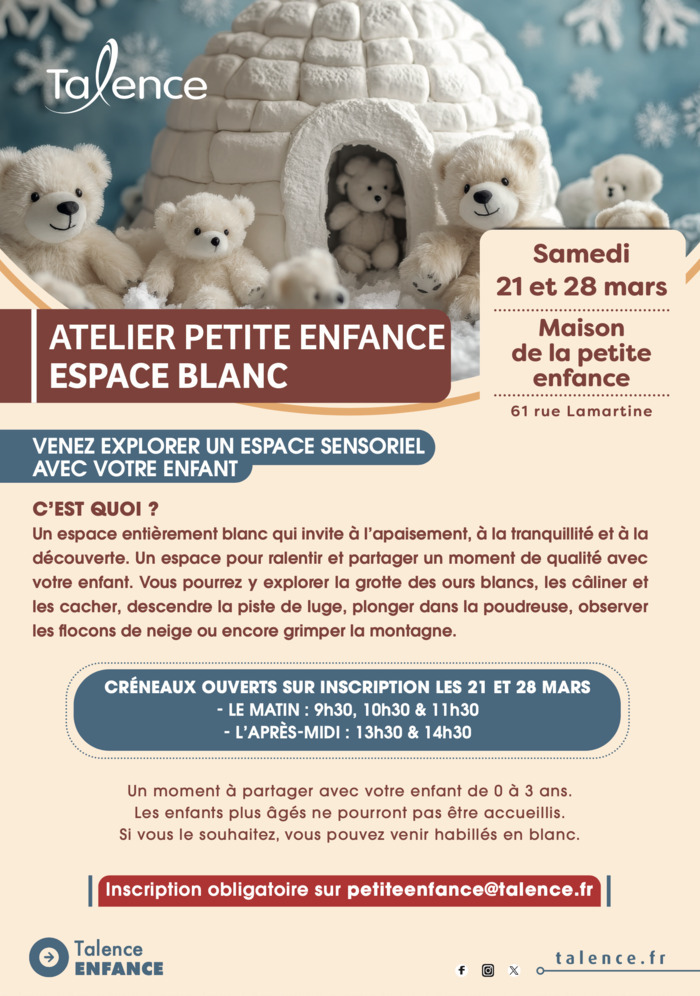 Dans un espace entièrement blanc, propice à l’apaisement et à la découverte, parents et enfants sont invités à ralentir et à vivre un moment de qualité ensemble. Les enfants pourront explorer différents univers imaginaires : la grotte des ours blancs, une piste de luge, la poudreuse ou encore des flocons de neige, dans un environnement stimulant et sécurisant.