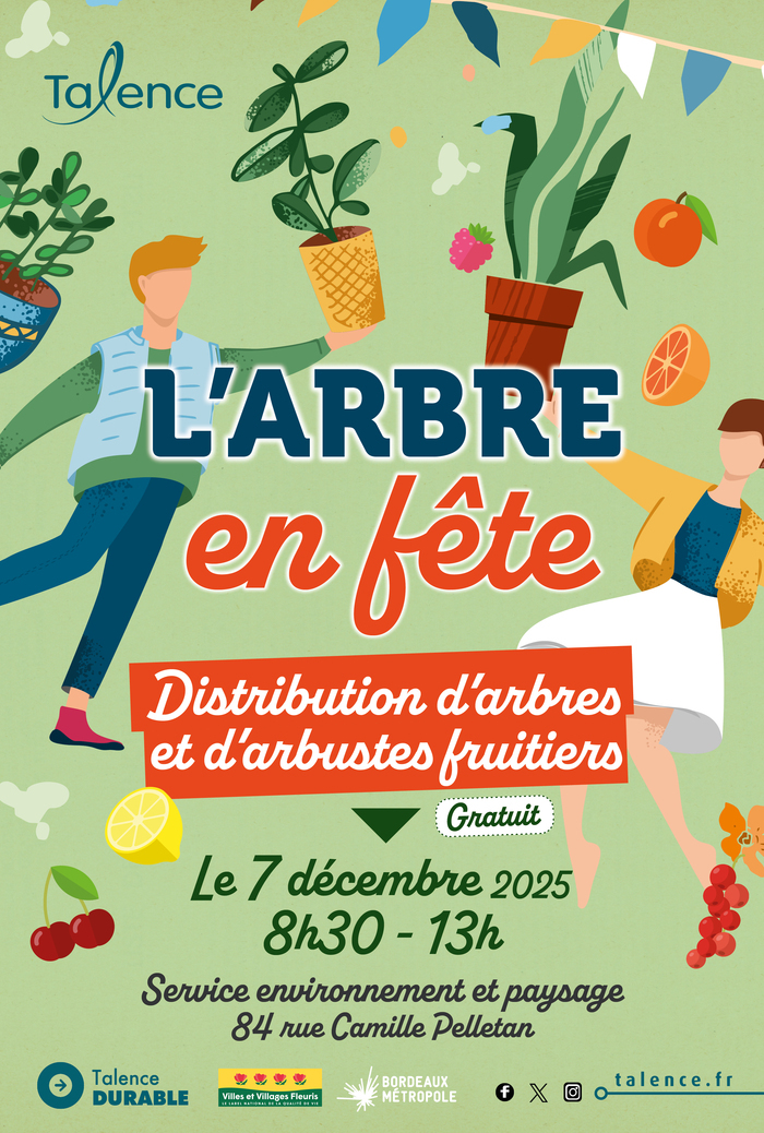Cette année encore, la Ville et Bordeaux Métropole s'associent dans le cadre de « L’arbre en fête » afin de proposer une distribution gratuite de d'arbres et d'arbustes aux Talençais. À Talence, elle aura lieu le dimanche 7 décembre entre 8h30 et 13h au service environnement et paysage de la Ville.