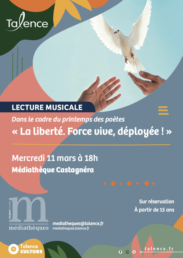 Dans le cadre du Printemps des Poètes, les médiathèques de Talence et l’EMMD proposent une lecture musicale de poésie, autour du thème « La liberté. Force vive, déployée ! ».