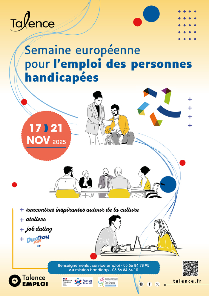 Dans le cadre de la Semaine Européenne de l’Emploi des Personnes Handicapées - #SEEPH 2025, le Service Emploi et la mission handicap de la Ville de Talence, en partenariat avec France Travail, Cap Emploi et la Mission Locale des Graves organisent de nombreux événements du 17 au 21 novembre 2025, au Dôme de Talence, situé au 221 avenue de Thouars.