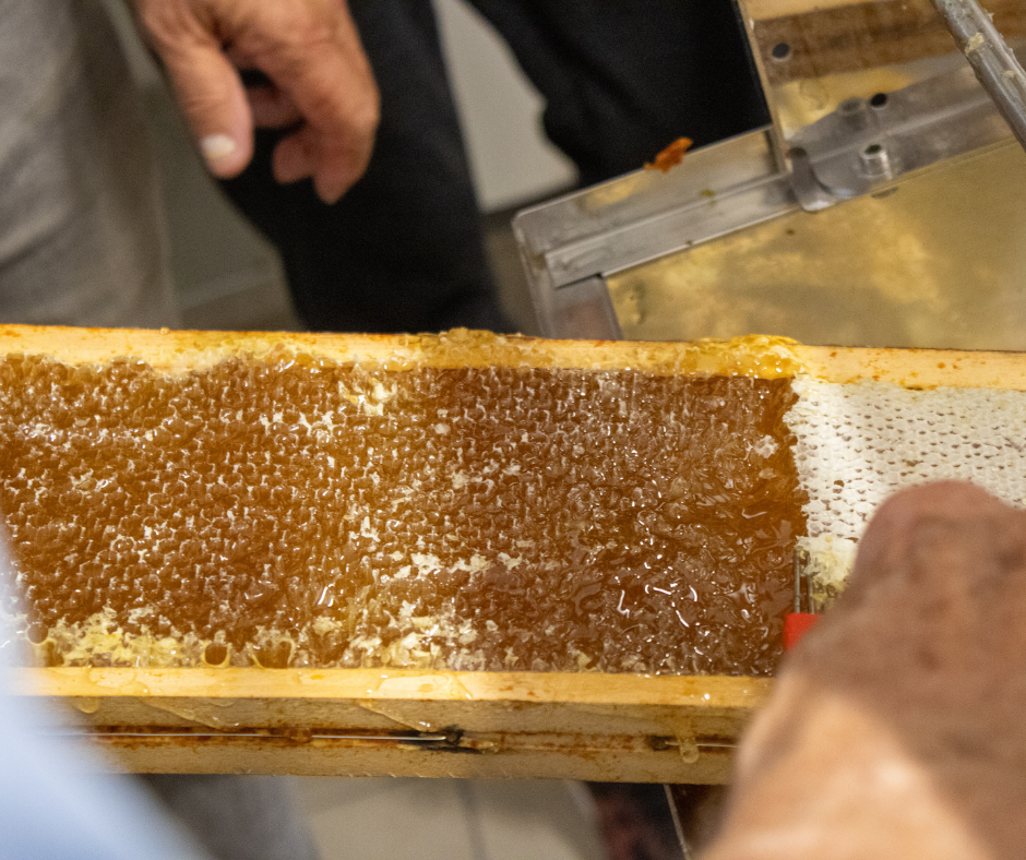 Les 120 cadres sont ensuite placés dans une centrifugeuse qui récupère le miel contenu dans les alvéoles. Un second filtrage se fait dans un appareil dédié.