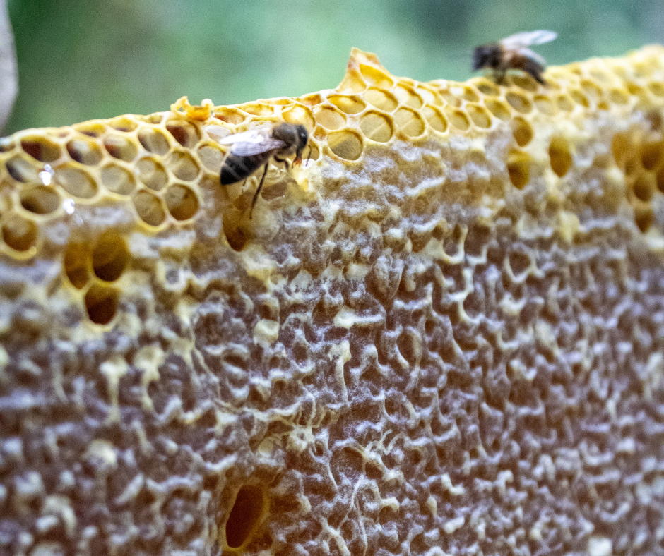 Au printemps, les abeilles produisent le miel à partir du butinage et construisent dans la ruche des alvéoles avant d’y déposer le nectar.