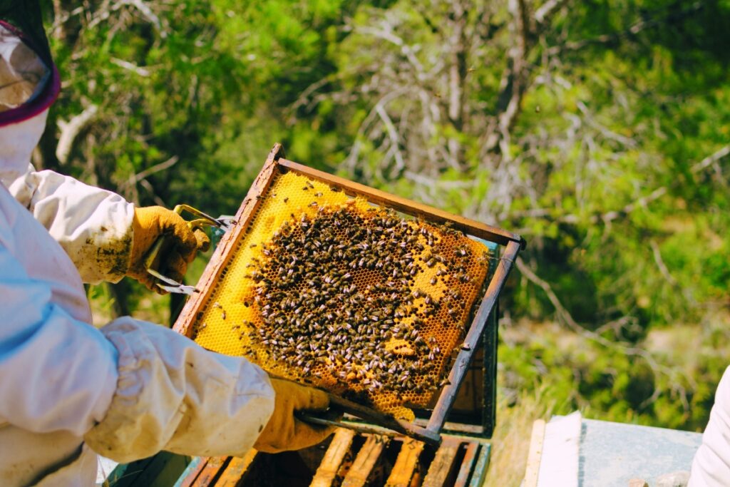 La récolte se fait à la fin du mois de juillet et dure près de quatre heures. Plusieurs étapes sont nécessaires pour mettre la récolte en pot : une fois les hausses ramenées des ruches du bois, il faut les désoperculer, c’est-à-dire enlever le chapeau de cire sur les alvéoles.