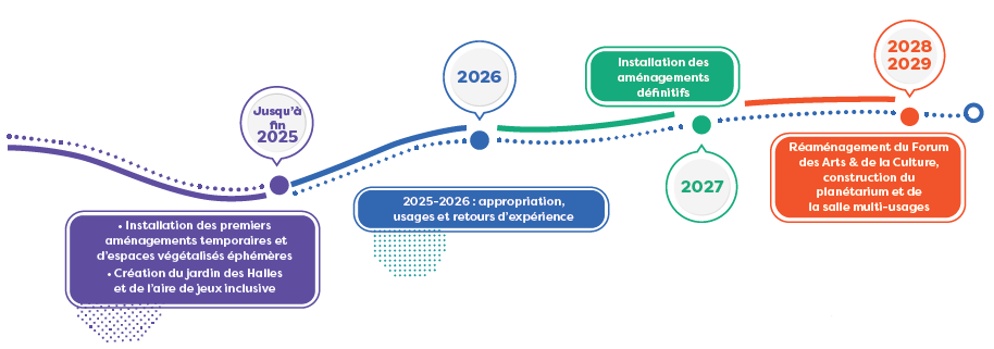 Une phase transitoire est en cours et permet de tester les usages futurs et de vous impliquer dans la réhabilitation. La seconde phase commencera début 2027 et permettra de réaliser les aménagements définitifs avec vos retours.
