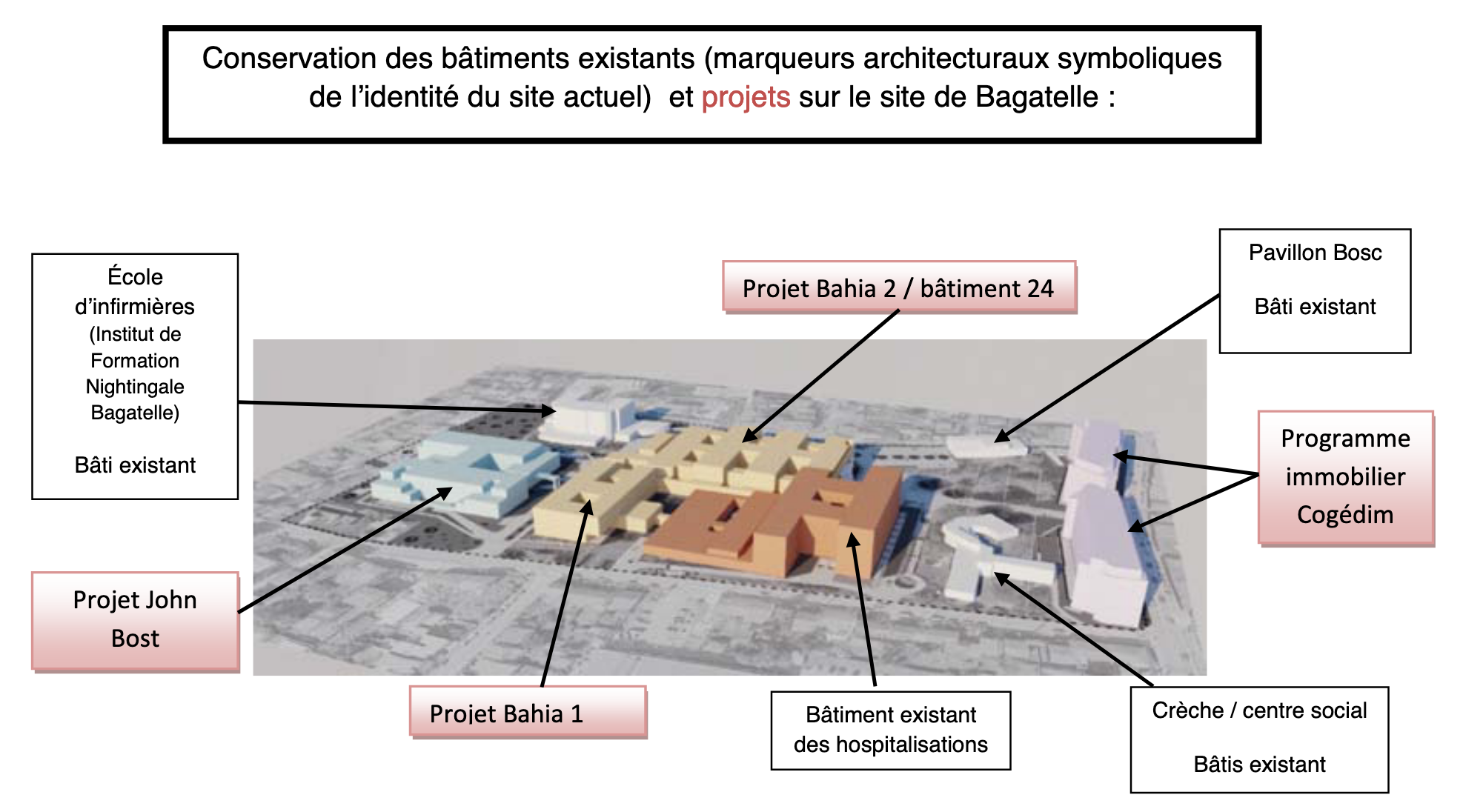 Le groupement BAHIA est le porteur du projet. BAHIA est un groupement de coopération sanitaire (GCS) de moyens, créé en 2012, fruit de l’union entre la Maison de Santé Protestante de Bordeaux Bagatelle et de l’Hôpital d’Instruction des Armées Robert Picqué (HIARP) situés dans la zone sud de Bordeaux Métropole.La Maison de Santé Protestante de Bordeaux-Bagatelle (MSPB) existe depuis 1863. Reconnue d’utilité publique en 1867, elle s’installe après la Première Guerre Mondiale sur l’emplacement actuel de Talence. Elle assure des missions de soins hospitaliers, de dispensaire, de soins à domicile et d’enseignement.L’Hôpital militaire Robert Picqué s’est établi sur le site de l’ancien hôpital du Becquet à Villenave-d’Ornon en 1936. L’établissement prend l’appellation d’Hôpital militaire des Armées en 1960, puis d’Hôpital d’Instruction des Armées (HIA) en 1966. Il est rattaché aux unités militaires du grand Sud-Ouest et participe également au service public en secteur. Ces deux structures ont en commun, outre le fait d’être proches géographiquement, moins d’un kilomètre, d’avoir une identité bien affichée quoique différente et d’être présentes dans le paysage bordelais depuis de très nombreuses années. Renommé notamment pour les urgences dentaires, l’HIA Robert Picqué reçoit aujourd’hui les patients civils et militaires requérant des soins. La Maison de Santé Protestante Bagatelle exerce des activités de soins de médecine, chirurgie et obstétrique (3ème maternité de la Métropole). Les deux structures ont un ancrage dans la mémoire collective locale et sont fortes d’une symbolique du soin. Portées par la conjoncture actuelle, elles ont décidé d’unir leurs moyens afin de catalyser la qualité de leur offre de soins et optimiser la performance de leur fonctionnement.