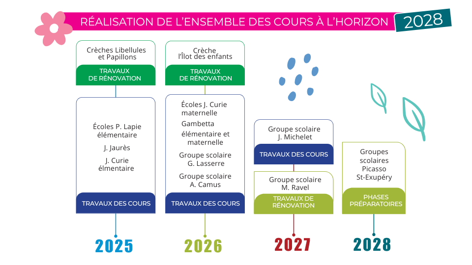 Entre 2024 et 2027, la Ville s’attaque à la désartificialisation et à la végétalisation des cours d’écoles. L’objectif est à la fois de lutter contre les îlots de chaleur et de créer des espaces plus verts et inclusifs, où chaque enfant peut trouver sa place.