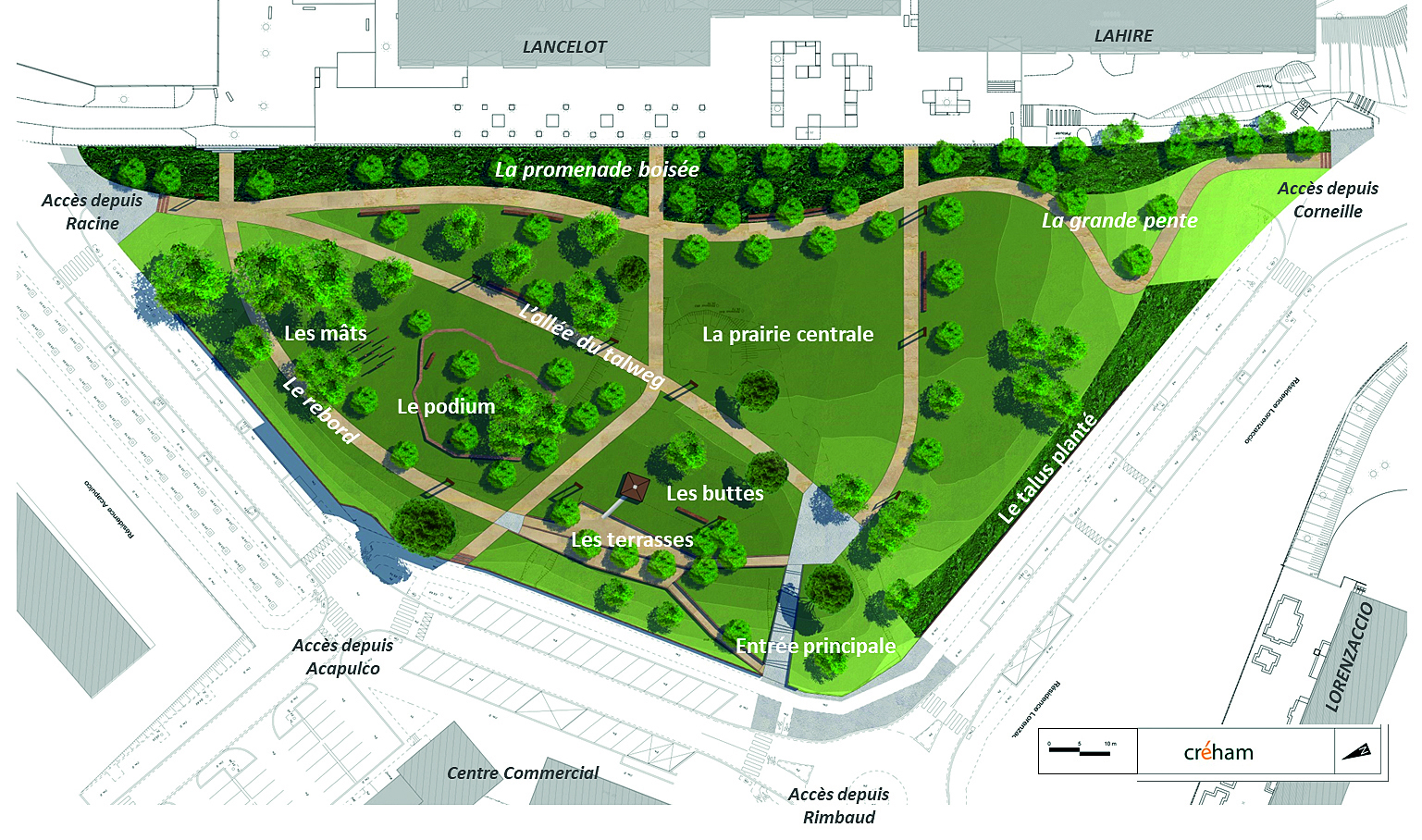 Objectif : créer un vaste parc d’1,2 hectare avec des voies douces accessibles à tous, une aire de jeux, des espaces de respiration et des pistes cyclables.