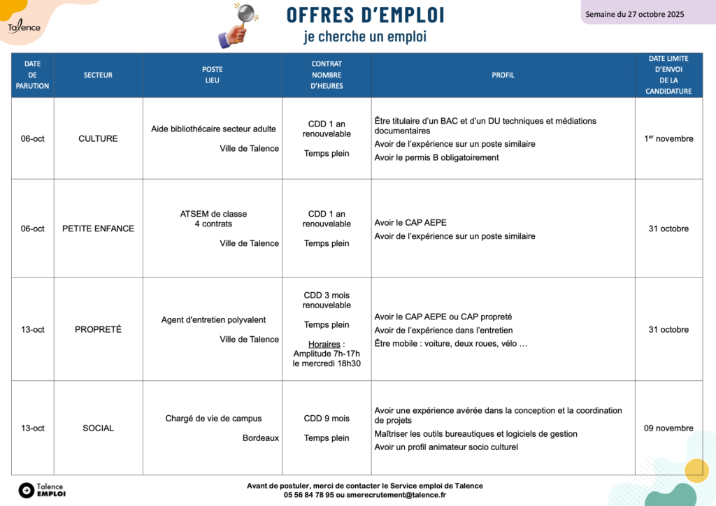 La ville de Talence recrute par voie de détachement, de mutation ou concours, n’hésite pas à consulter nos offres sur Emploi territorial.