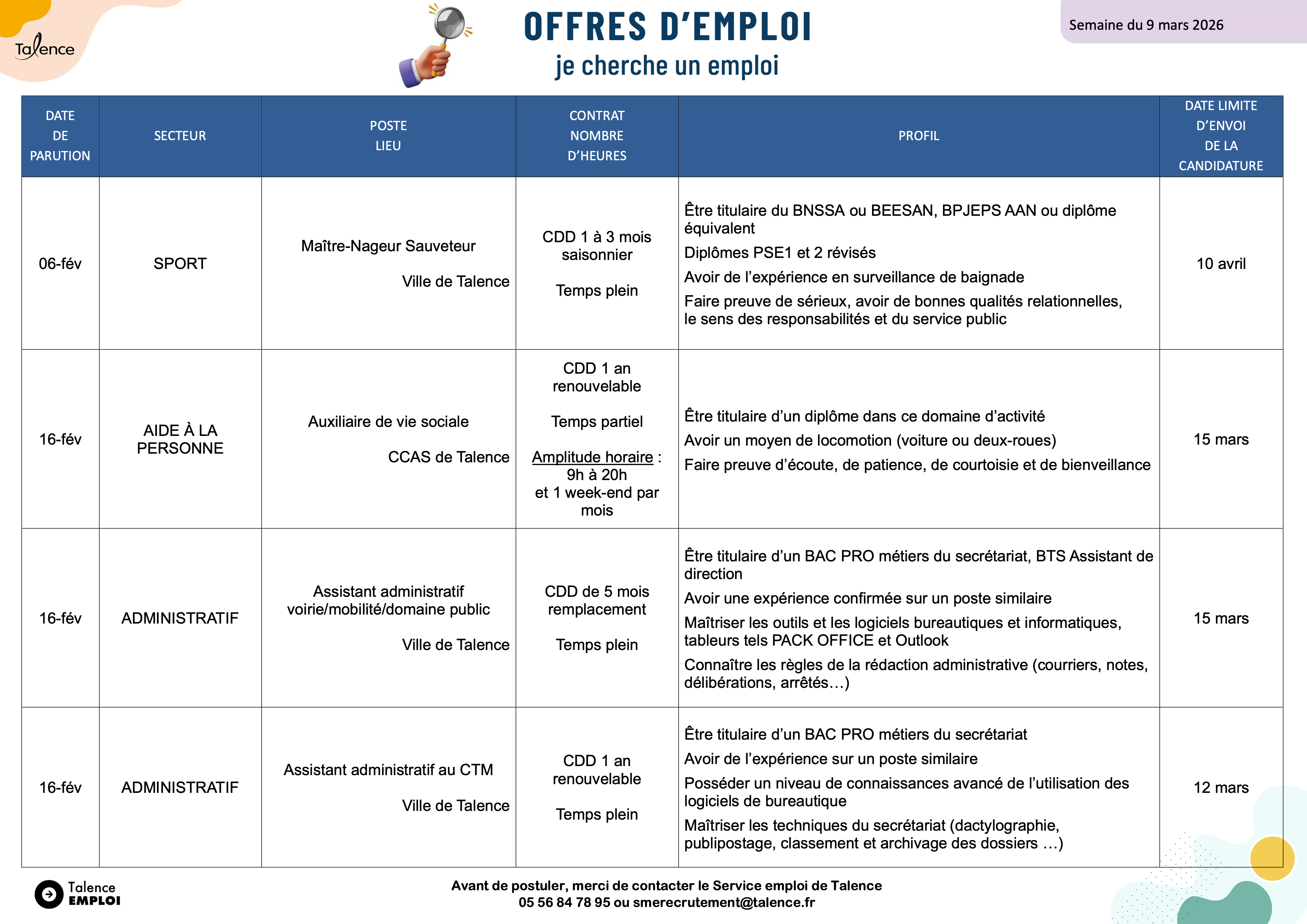 La ville de Talence recrute par voie de détachement, de mutation ou concours, n’hésite pas à consulter nos offres sur Emploi territorial.